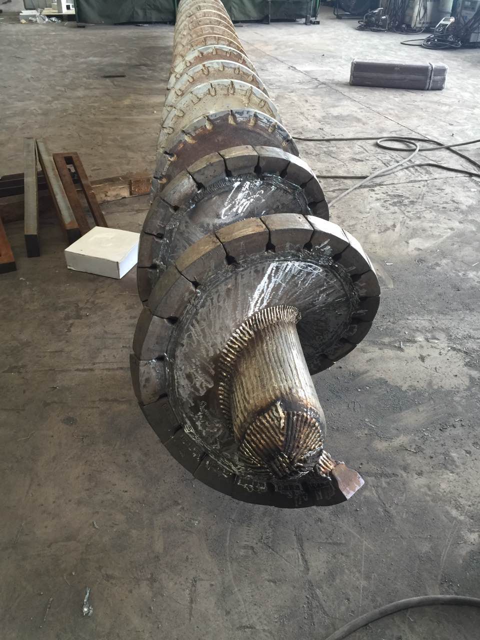輸送礦料的螺旋輸送機(jī)由于受輸送物料的磨蝕而沖蝕而發(fā)生磨損,長期處于這種工況下,螺旋輸送機(jī)的葉片會發(fā)生損壞和報廢。為了延長螺旋輸送機(jī)葉片的使用壽命,一般會為螺旋輸送機(jī)的葉片進(jìn)行預(yù)保護(hù),比較常見的就是采用KNM60螺旋耐磨材料堆焊到螺旋輸送機(jī)的葉片易損部位上,用于對螺旋葉片的預(yù)保護(hù)。這樣制備的螺旋輸送機(jī)的葉片的耐磨性能大大提高,延長了螺旋輸送機(jī)的使用壽命。